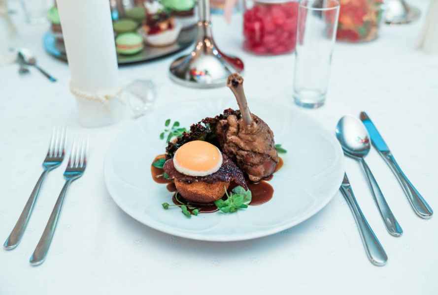 Delektowanie się wyśmienitymi potrawami uprzyjemnią urokliwe sale pałacowe oraz tarasy i ogród. To idealne miejsce, by w trakcie posiłku cieszyć się promieniami słońca i świeżym powietrzem. Romantyczną kolację uprzyjemniają wieczorne odgłosy natury, widok zachodzącego słońca oraz szum rozłożystych drzew.